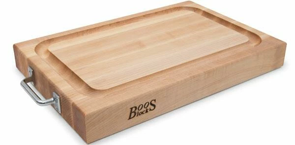 Boos Blocks Schneidebrett Prep2Serve aus Ahorn mit Edelstahlgriffen und Saftrille.