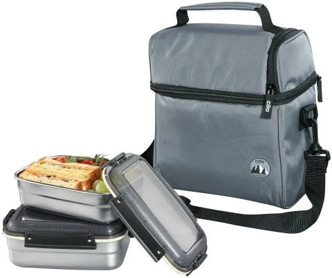 cilio Isoliertasche ROCCA in grau. Die ideale Tragetasche inkl. 2 Lunchboxen aus rostfreiem Edelstahl und auslaufsicherem Deckel.