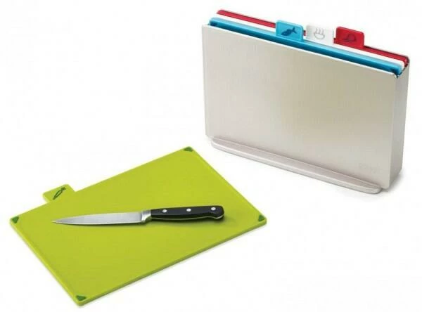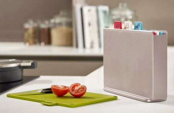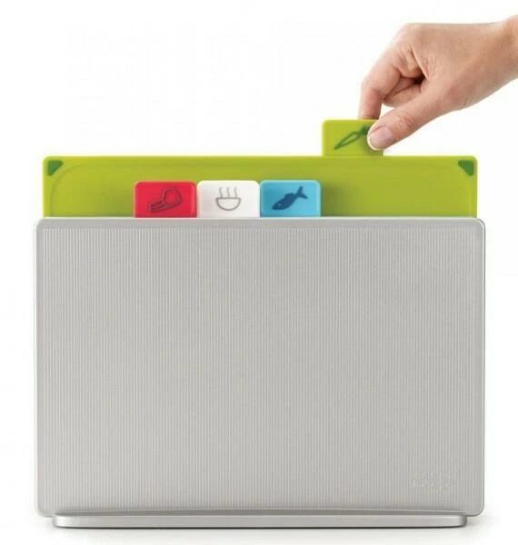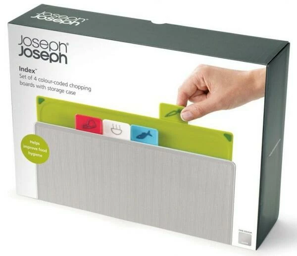 Seit seiner Einführung im Jahr 2008 hat sich das Schneidebretter-Set Index von Joseph Joseph zum weltweiten Verkaufsschlager entwickelt und hilft Ihnen dabei, die Kreuzkontamination von genutzten Lebensmitteln durch ein einfaches und zugleich effektives System farblich gekennzeichneter Schneidebretter zu verringern. Obwohl das ursprüngliche Konzept stets gleich geblieben ist, gab es innerhalb der letzten Jahre eine Reihe von Designverbesserungen und Produkterweiterungen, die sich in dieser Serie widerspiegeln. Wie die Vorgänger-Modelle auch verfügt das Schneidebretter-Set Index über leicht zu fassende Laschen mit Lebensmittelsymbolen und rutschfeste Füße auf beiden Seiten. Abgeschrägte Kanten sorgen für das Auffangen von Resten wie z.B. Krümeln und Flüssigkeiten. Der Aufbewahrungsbehälter zeichnet sich ebenfalls durch eine rutschfeste Unterseite aus.