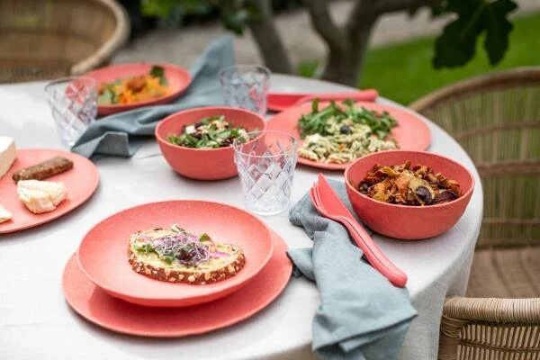 koziol Teller groß, 4er-Set in coral. Ideal für die Verwendung Outdoor, sei es im Garten, beim Camping oder beim Picknick.