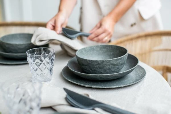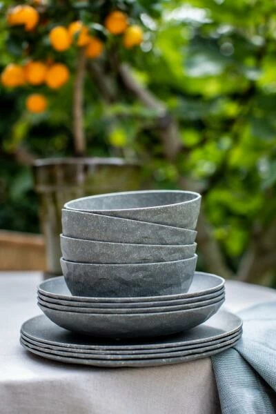 Die facettierten Teller sind wie eine frische Sommerbrise beim Outdoor-Lunch oder Terrassen-Dinner und halten auch turbulenten Feiern ohne jeden Scherbenhaufen stand. Ihre solide Materialität und die modernen Farben vermitteln stets das gute Gefühl eines schön gedeckten Tisches und bleiben dank ihrer schweren Qualität selbst bei einem kräftigen Windstoß stets standfest.