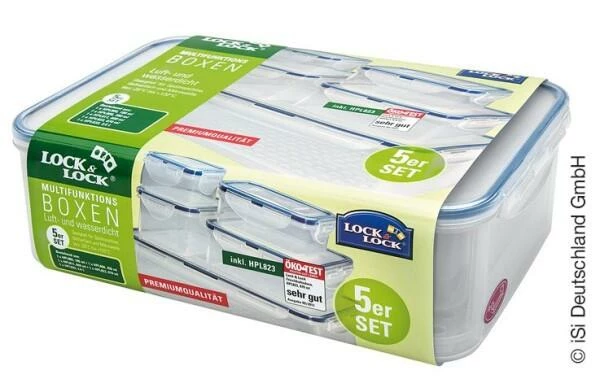 - Ausmaße: 1 x HPL833 (3,6 ltr.) 301x188x94mm, 1 x HPL823 (870 ml) 155x155x60mm, 1 x HPL811 (600 ml) 151x108x69mm, 1 x HPL806 (350 ml) 135x102x52mm, 1 x HPL805 (180 ml) 108x88x48mm