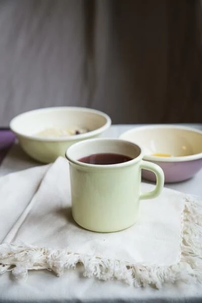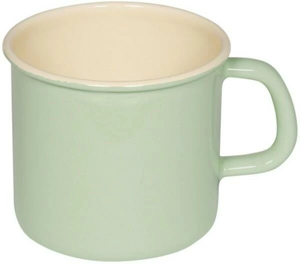 Riess Becher aus Emaille in nilgrün. Trinkbecher mit Griff und Bördelrand aus Emaille, ideal für Tee, Kaffee und andere Heiß- oder Kaltgetränke. Warme Getränke können direkt in der Tasse auf dem Herd erwärmt werden.