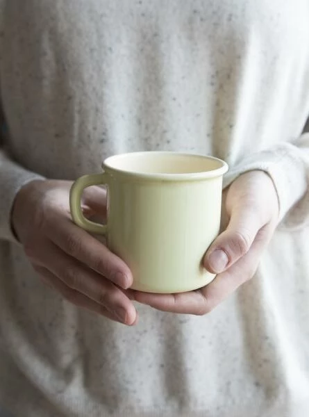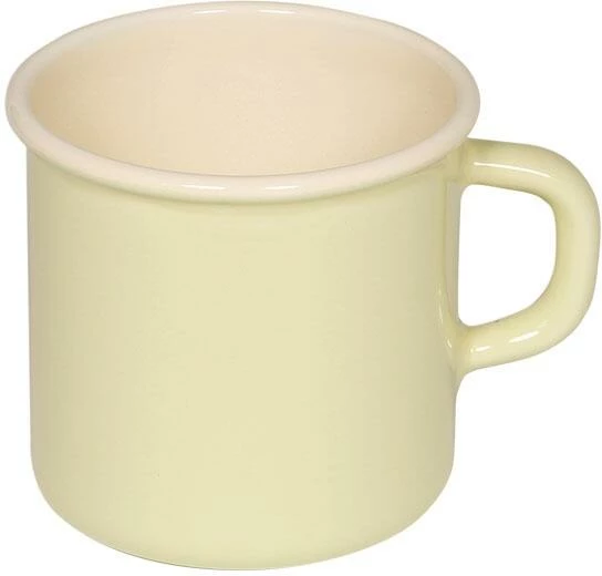 Riess Becher aus Emaille in pastell-gelb. Trinkbecher mit Griff und Bördelrand aus Emaille, ideal für Tee, Kaffee und andere Heiß- oder Kaltgetränke. Warme Getränke können direkt in der Tasse auf dem Herd erwärmt werden.