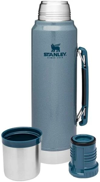 Die aus rostfreiem 18/8 Edelstahl gefertigte Stanley CLASSIC VAKUUM-FLASCHE ist mit einer schützenden, Hammertone Ice Lackierung versehen. Die doppelwandige Vakuum-Isolation hält Getränke bis zu 24 Stunden heiß oder kalt. Der seitlich montierte Kunststofftragegriff sorgt für den problemlosen Transport der Flasche. Über dem Flaschenverschluss sitzt ein Trinkbecher, der ebenfalls isolierend ausgelegt ist. Durch die 5 cm weite Öffnung lässt sich die Flasche sehr gut reinigen. Fassungsvermögen 1 Liter.