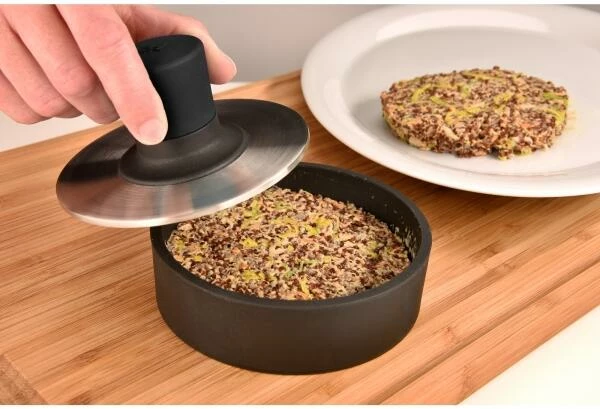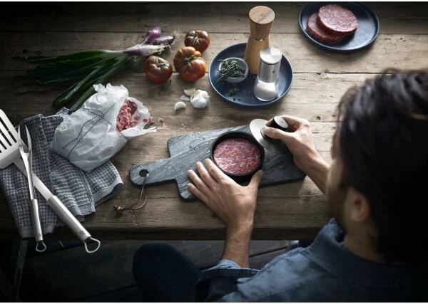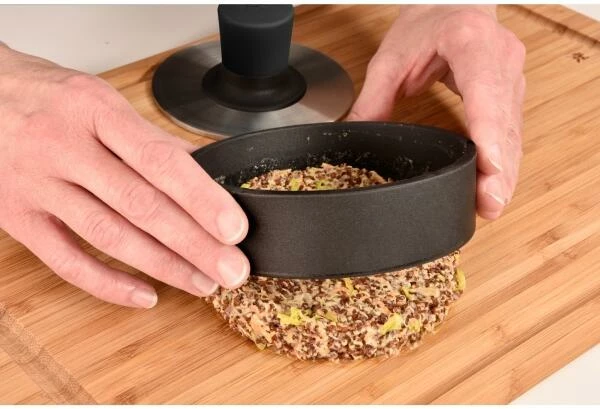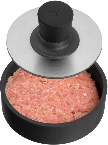 Diese WMF Burgerpresse ist das ideale Grillzubehör für alle Burgerfans, Ob Cheeseburger, Hamburger oder auch vegetarische Burger mit der Pattypresse bringt jeder seine Patties in die richtige Form. Die handliche Burger Patty Presse formt schnell und gleichmäßig Patties aus Fleisch und Gemüse. Durch die einheitliche Größe haben alle Patties (ø 11,5 cm) die gleichen Garzeiten. Der handliche Komfortgriff aus Kunststoff sorgt für eine angenehmere Druckverteilung beim Pressen. So werden keine Bindestoffe für eine optimale Formstabilität benötigt. Die Burgerpresse ist einfach zu reinigen, da sie in die Spülmaschine gegeben werden kann. Außerdem besteht sie aus einem offenen Ring, sodass keine Zutatenreste am Rand des Bodens hängen bleiben. Auf die Burger – fertig – Los!