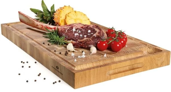 Dieser kernige Hackblock hält einiges aus. Er ist 54 cm lang, 30 cm breit und 4 cm hoch. Er ist aus Eichenholz gefertigt und das alleine macht ihn schon besonders robust und langlebig. Zassenhaus verwendet zudem Stirnholz, das gegen die Faserrichtung geschnitten wird. Es ist enorm widerstandsfähig und die Schnitte schließen sich wieder, wenn Fleisch, Obst, Gemüse oder Käse auf dem Hackblock zerkleinert wird. Besonders praktisch ist die Saftrinne, der Hackblock ist gemacht für die tägliche Nutzung und hält starker Beanspruchung mühelos stand. Dank seiner attraktiven Optik und der edlen Maserung kann man ihn auch zum Servieren nutzen.